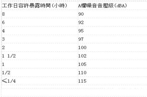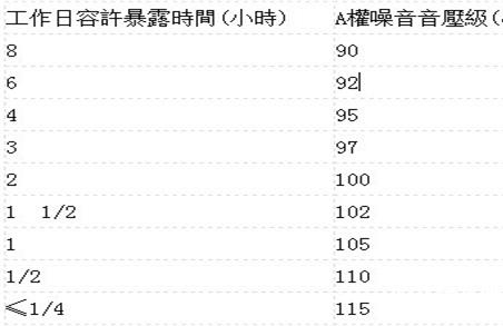 備註:勞工工作日暴露於二種以上之音壓級之噪音時,要考錄其相互效應而非個別之效應。其暴露劑量之計算方式為:C(1)/T(1) + C(2)/T(2) C(n)/T(n),其和大於 1時,即屬超出容許暴露劑量。Cn表示個別音壓級之暴露時間,Tn表示該噪音音壓級對應容許暴露時間。任何時間不得暴露於峰值超過 140dB之衝擊性噪音。