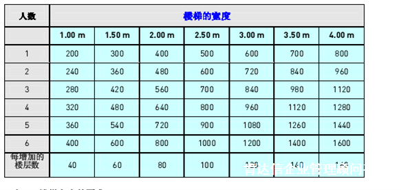 在建筑物的樓層數(樓層越多,越容易計算通過樓梯寬度的人員數)