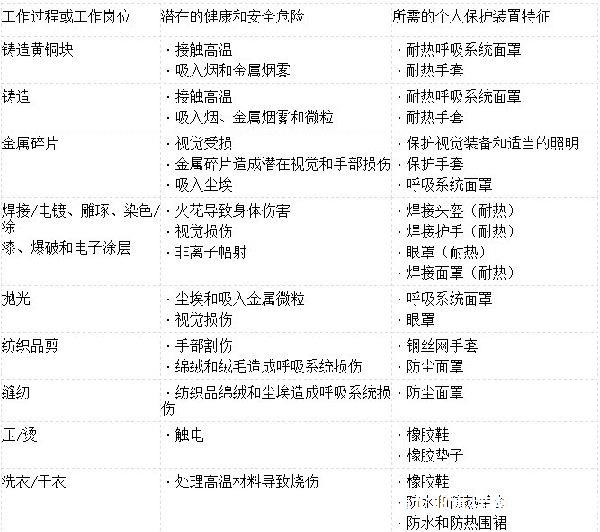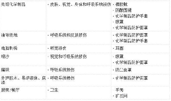 注意:該表格只是舉例而非包括所有內容。應研究并遵守當地的健康和安全規定以提供額外的保護。